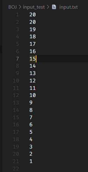 먼저 푼 문제와 동일한 방식으로 input.txt에 예제를 만든다. 문제의 예제에서는 5줄이 주어졌지만 확인을 위해 20줄을 넣었다.