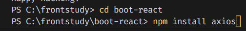 리액트 프로젝트 경로에 들어가서 비동기 통신에 필요한 axios와 CORS 오류를 해결하기 위한 http-proxy-middleware를 npm으로 설치한다.