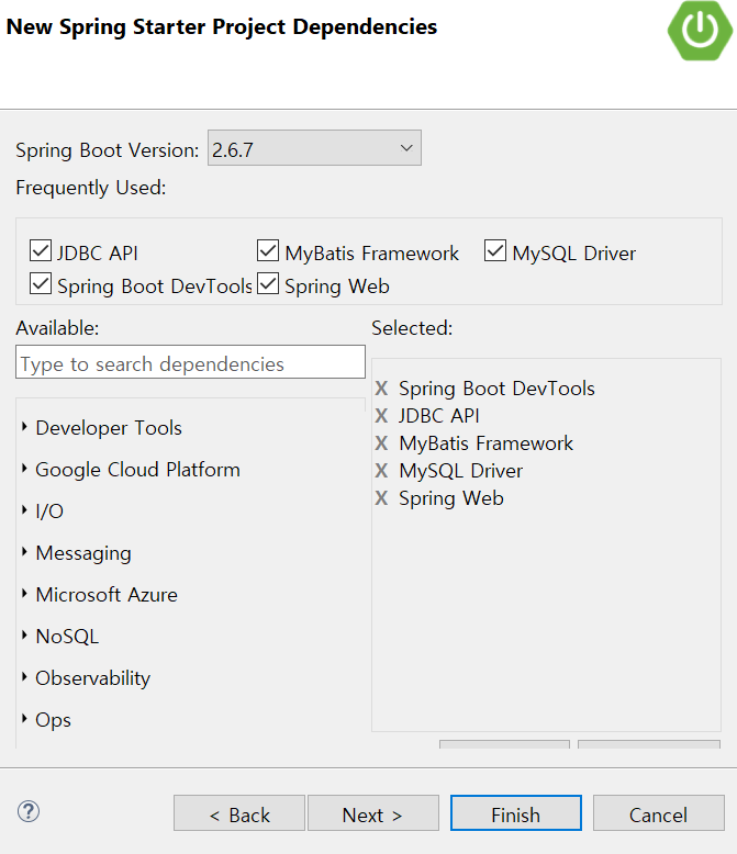 향후에 myBatis를 통해 db에 연결하기 위한 의존성, 편리한 의존성들을 추가했다.