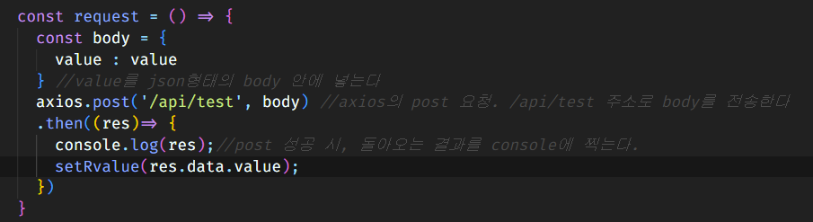 작성 후, 스프링 부트 프로젝트를 실행하고 아까 만든 리액트 컴포넌트에서 요청을 보내본다.